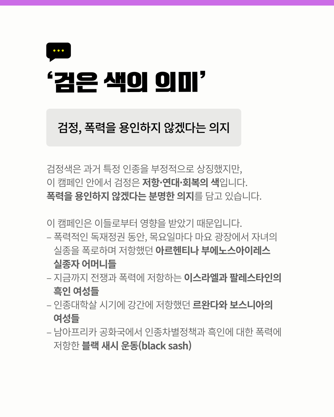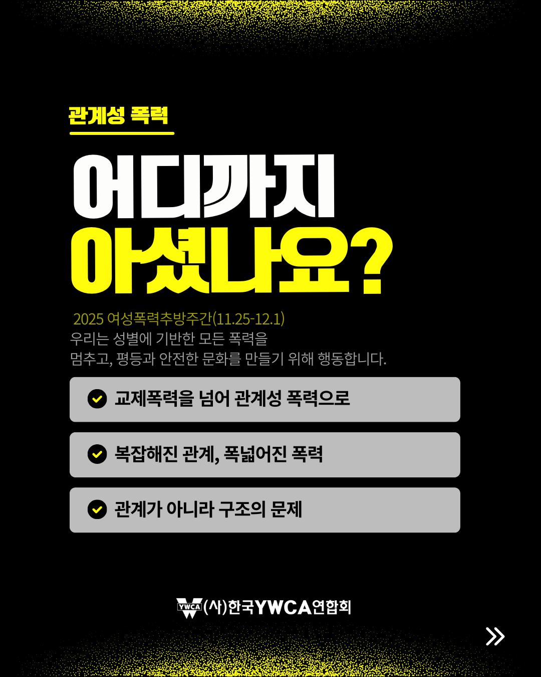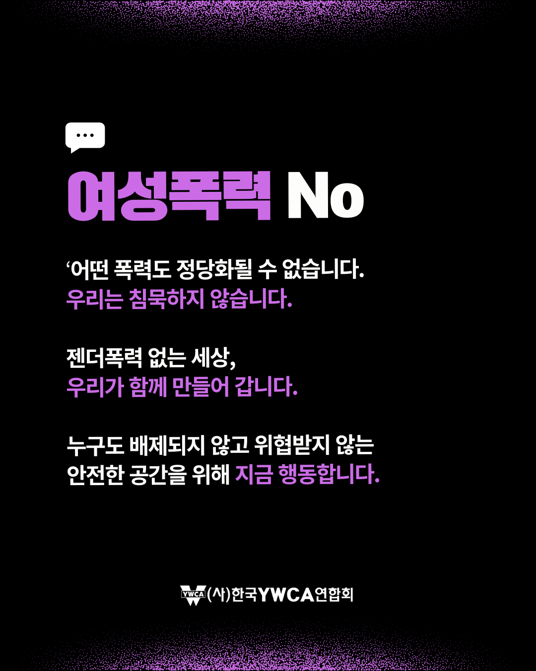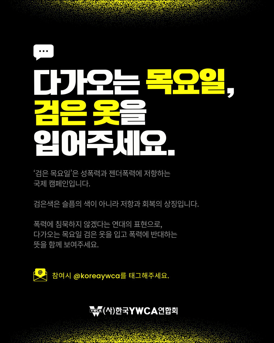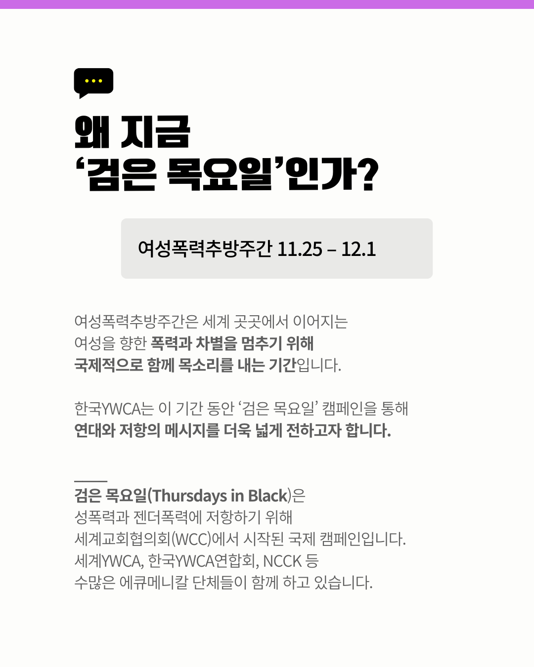 11월 25일은 유엔이 정한 '세계 여성폭력 추방의 날'입니다.이를 기념하여 우리나라는 11월 25일(화)~12월 1일(월)까지 여성폭력추방주간으로 보냅니다. 이 주간을 기념해 의정부YWCA 또한 ‘검은 목요일 캠페인’을 진행합니다.✔ 교제폭력을 넘어 관계성 폭력으로 보기✔ 복잡해진 관계 속 폭넓어진 폭력✔ 개인 문제가 아닌 구조의 문제성평등하고 안전한 문화를 위해 우리의 관심과 행동이 필요합니다.